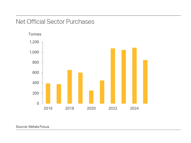 In fact, 2025 was the fourth-largest expansion of central bank gold reserves on record. The all-time high was set in 2022 (1,136 tonnes). It was the highest level of net purchases on record, dating back to 1950, including since the suspension of dollar convertibility into gold in 1971.