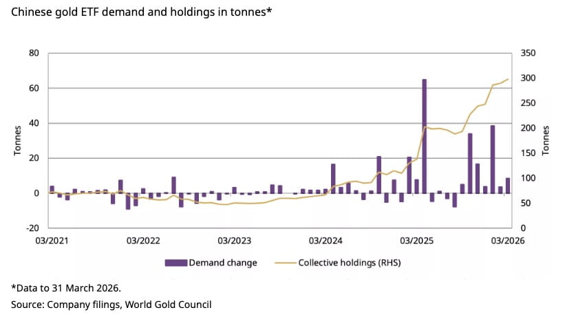 Thanks to a combination of rising prices and gold inflows, assets under management (AUM) by Chinese ETFs rose 26 percent to ¥304 billion ($44 billion) and total gold holdings climbed to 298 tonnes in Q1.