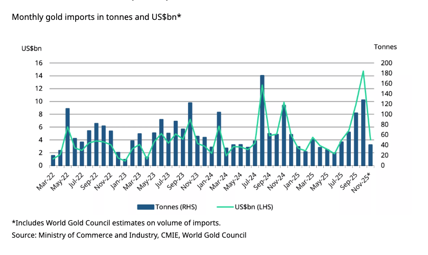 “The preference towards investment-focused buying is reflected in the volume of gold imports, which rose sharply to 340 tonnes between July and October, compared with 204 tonnes between January and June, underscoring the resilience of investment-led demand.”
